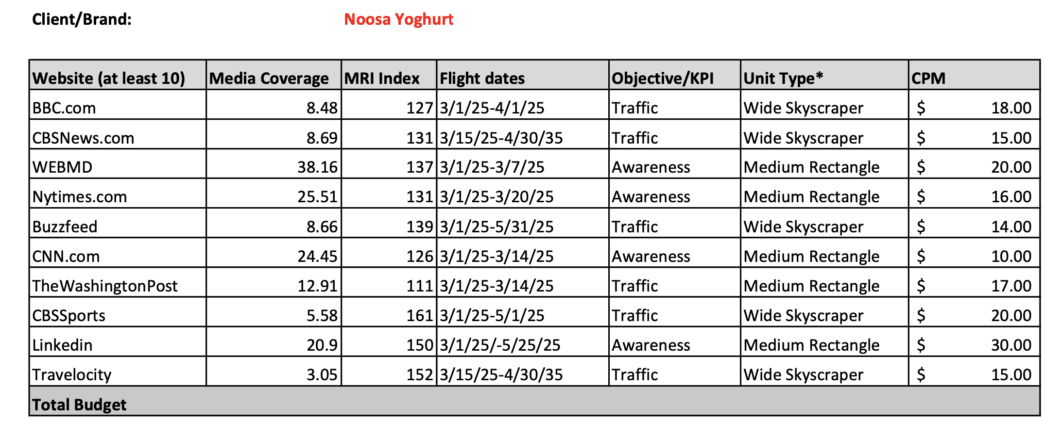 Increasing sales will require using multiple outlets to attract audiences that are drawn to Noosa Yoghurt. First, BBC (127, 8.48%, MRI-FS, 2021) because it reaches multiple age groups from Gen-Z to Millennials, and 44% say that they like BBC content more than others. CNN (126, 24.45%, MRI-FS, 2024) would be used because it is in the top 5 programs for adults and also targets Millennials. LinkedIn users also target millennials (150, 20.9%, MRI-FS, 2024) and more than 53% of users have an average income of $100,000. Buzzfeed (139, 8.66%, MRI-FS, 2024) has a close relationship with millennials ages 25-34 and is known for a responsive audience. Use New York Times (131, 25.51%, MRI-FS, 2023) because it has an educated readership and more than 63% of readers are under 50. CBS Morning News (8.69%, 131, MRI-FS 2024) has had an increase of overall viewership by 489,000 (+9%), including both male and female audiences. Use The Washington Post (12.91%, 111, MRI-FS, 2021) considering this outlet is predominantly visited by U.S. citizens, encompassing 88% of viewership. Travelocity (152, 3.05%, MRI-FS, 2021) is focused on young families who have the funds to travel. CBS Sports (18.20%, 140, MRI-FS, 2021) has an evident audience with a college education or higher (63%,114) and viewers have a home value of 200k or higher (39%, 115). Use WebMD (38.16%, 137, MRI-FS,2021) because this outlet has the highest credibility (65%) in comparison to competitors in regard to health and wellness.